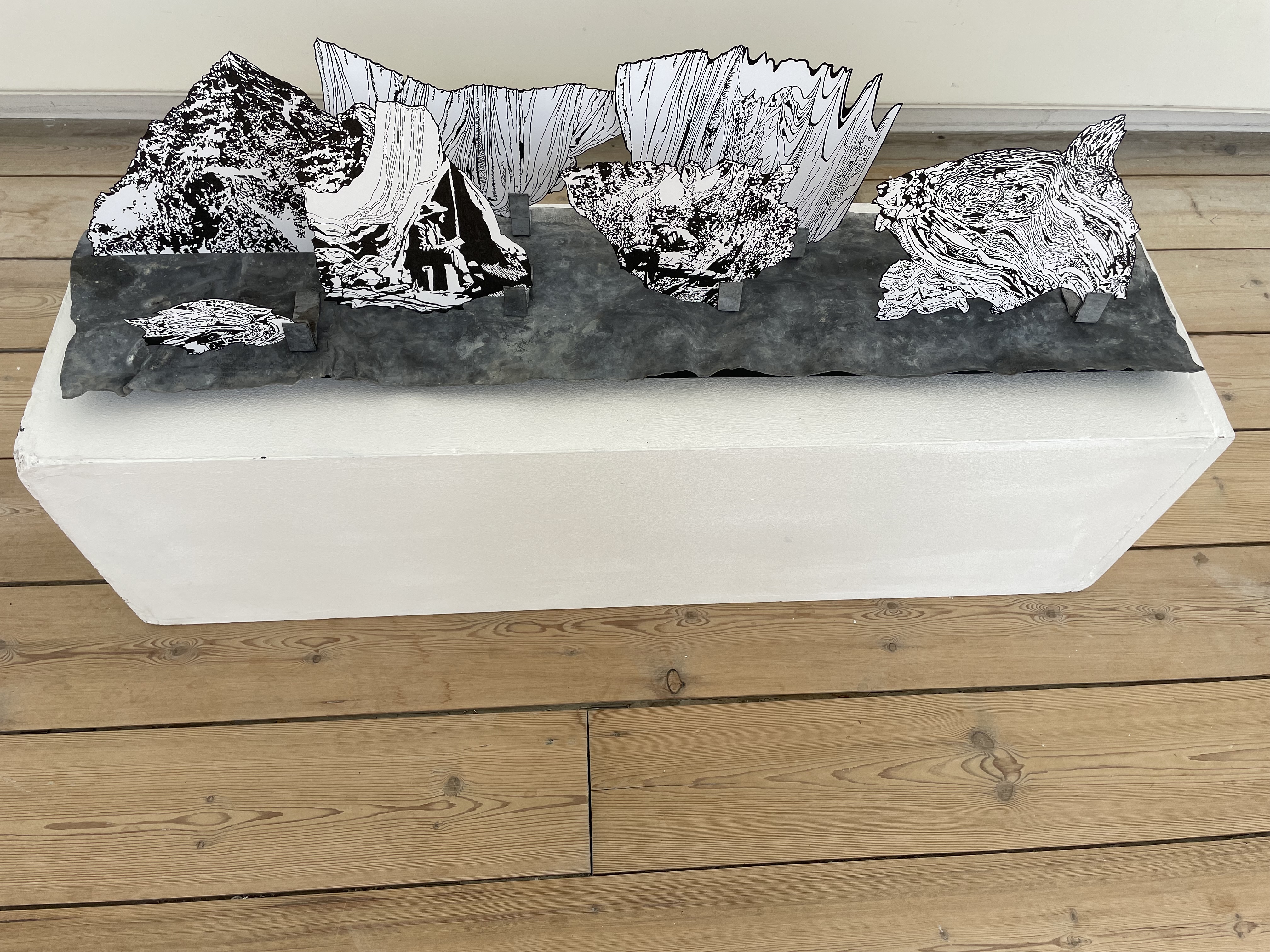 Center piece of " The world is another place" Consist of seven pieces of ink drawing, placed on a led plate upon plywood, messure : cm 100 x 25